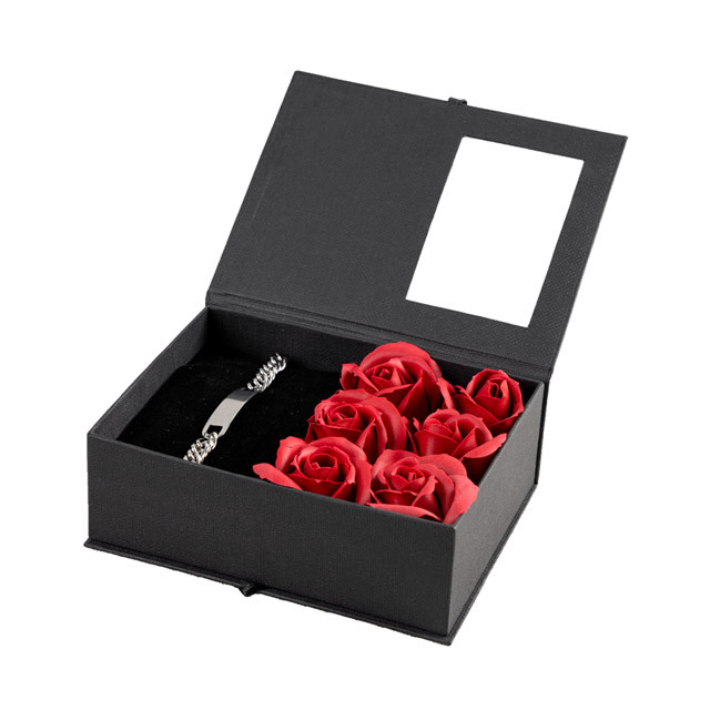 پک هدیه ولنتاین باکس گل و دستبند استیل نقره ای